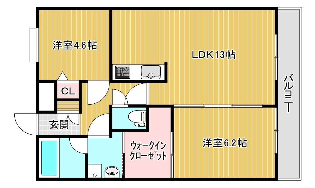| 間取り | 2LDK (洋6.2、洋4.6、LDK13) | |||