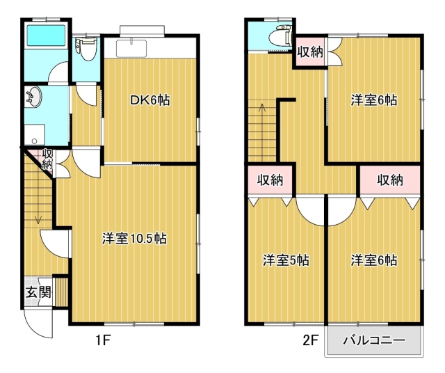 | 間取り | 4DK (1F:洋10.5 2F:洋6、洋5、洋6) | |||