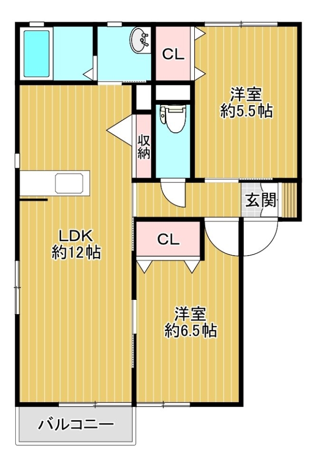 | 間取り | 2LDK (洋6.5、洋5.5、LDK12) | |||