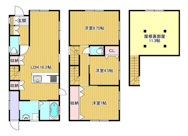 | 間取り | 3LDK (1F:LDK16.3 2F:洋8.8、洋7、洋4.5、屋根裏11.3) | |||